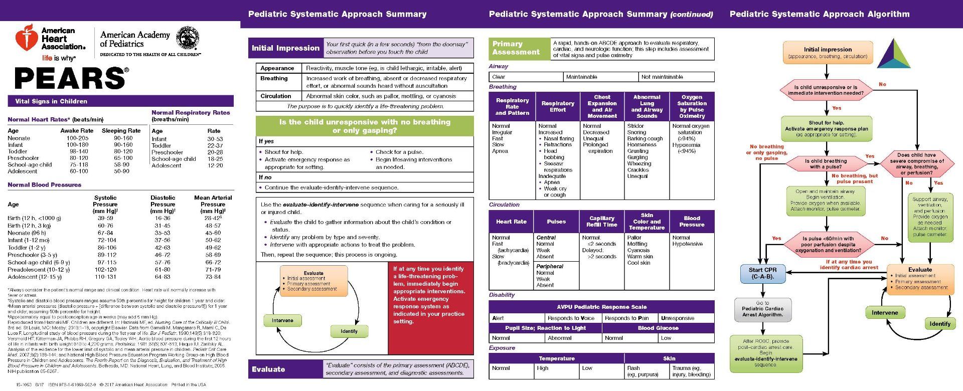 The PEARS Pocket Reference Card is a 4″ x 6.5″ card provides a convenient, quick reference tool for healthcare professionals to use during the PEARS Course and in a variety of healthcare settings. It consists of 4 panels ranging in content from Vital Signs in Children to Identifying Circulatory Emergencies.